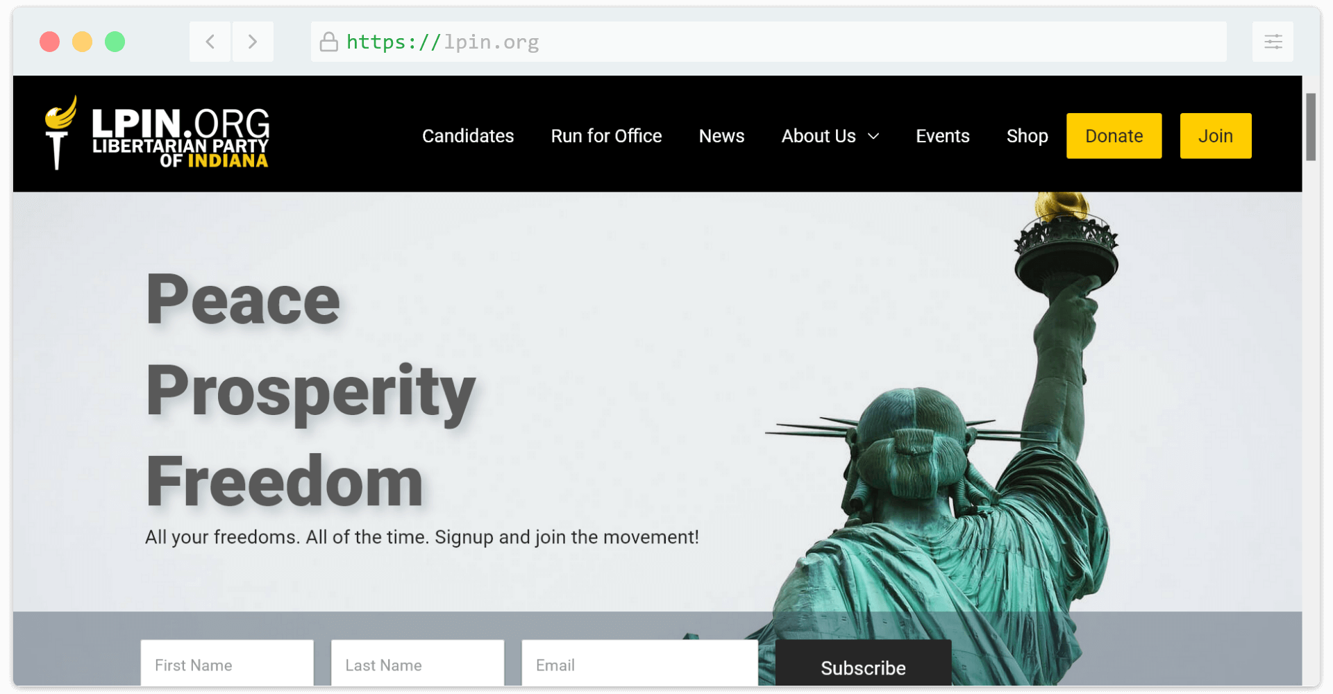 The Libertarian Party of Indiana is a leading state affiliate of the Libertarian Party and runs candidates for public office. The LPIN is committed to America’s heritage of freedom: individual liberty and personal responsibility, a free-market economy of abundance and prosperity, a foreign policy of non-intervention, peace and free trade.