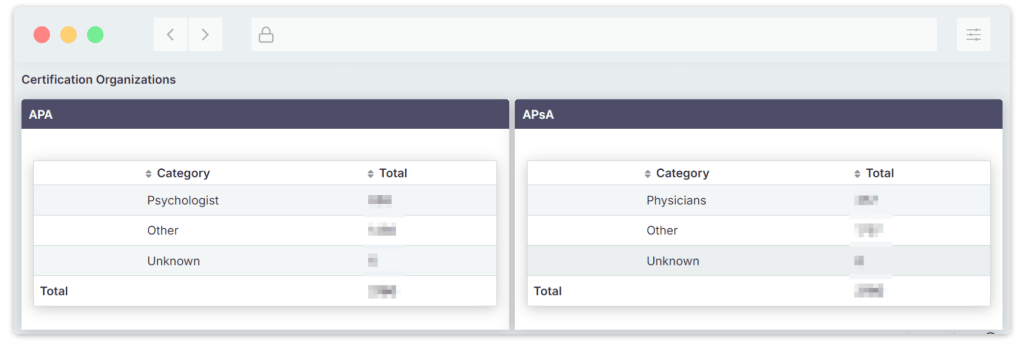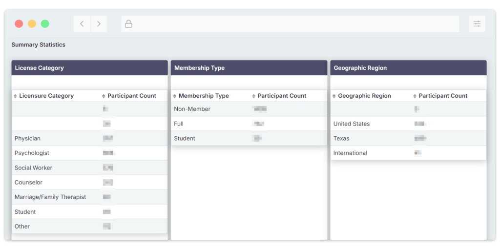 - Reporting for Accreditation: Created a dashboard for detailed APA/APsA reporting by tracking key event participation metrics such as attendee professions (e.g., physician, psychologist or neither) breaks down by geography, licensure type, and membership type. Board members can log in and view real-time reports, eliminating the back-and-forth with the Administrative Director.
